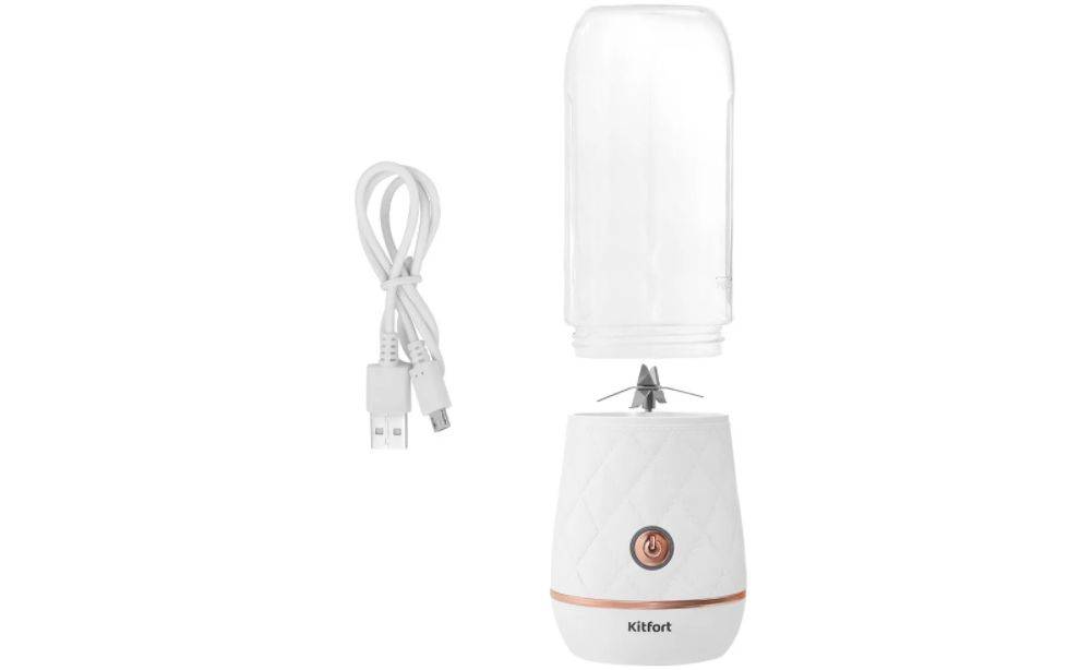 Портативный блендер Kitfort KT-3006 со встроенным аккумулятором оснащен острыми ножами из нержавеющей стали, справляющимися даже с колкой льда. Полного заряда хватает на 15 циклов по 35 секунд при работе на одной скорости 15000 об/мин. Устройство оснащено стеклянной емкостью на 350 мл и дополнено дорожной бутылочкой, двумя герметичными крышками и шнуром для зарядки. Нескользящие ножки гасят вибрацию при работе, не позволяя блендеру скользить по кухонному столу.