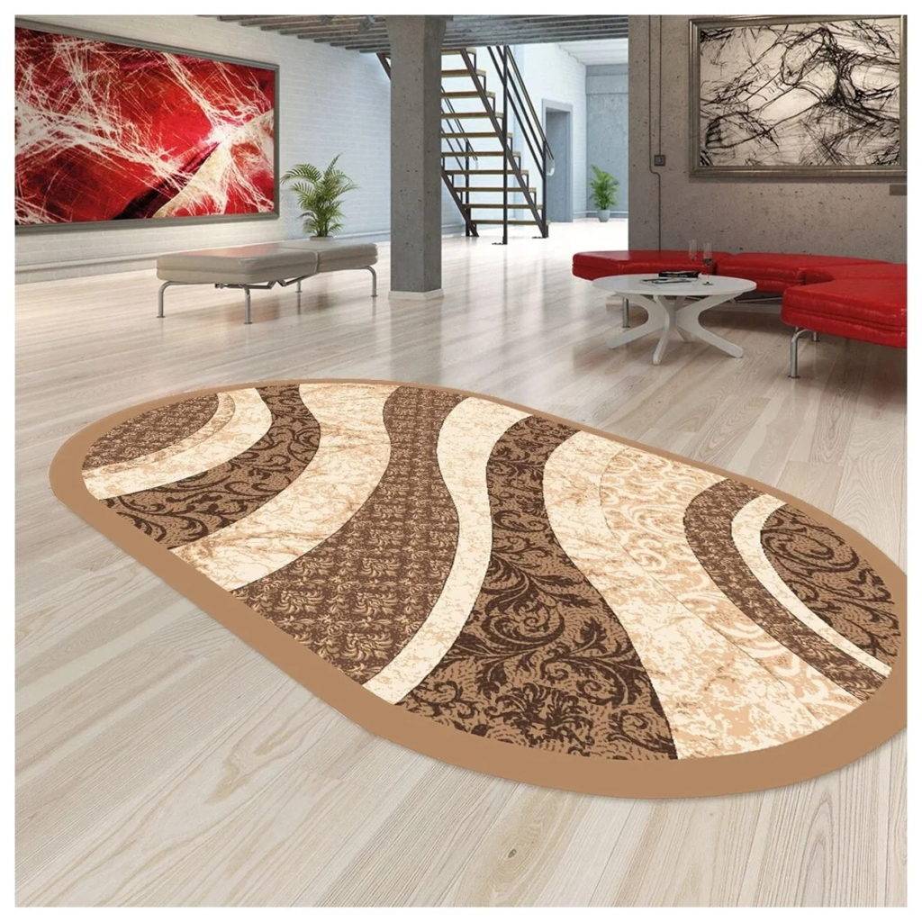 Это коврик отечественного производства сочетает приятный дизайн, практичность и бюджетность. Имеет овальную форму и короткий ворс. Рисунок выполнен в абстрактном стиле. Материал поливинилхлорид и полиамид. Стоимость — 504 рубля.