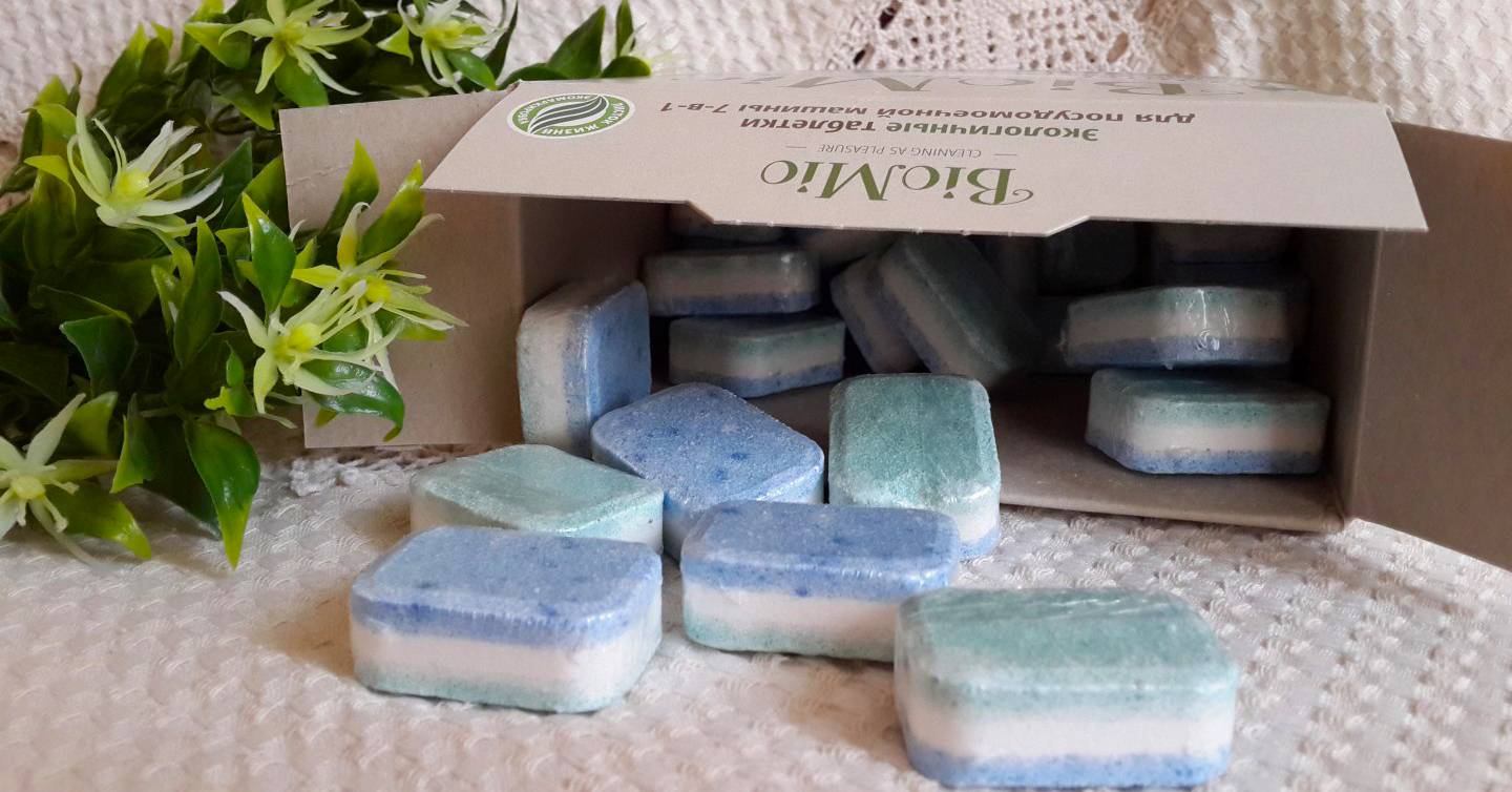 В номенклатуру выпускаемой продукции Bio Mio входят и таблетки для посудомоечных машин. В одной упаковке содержится 30 таблеток. Этого запаса хватает на один месяц.