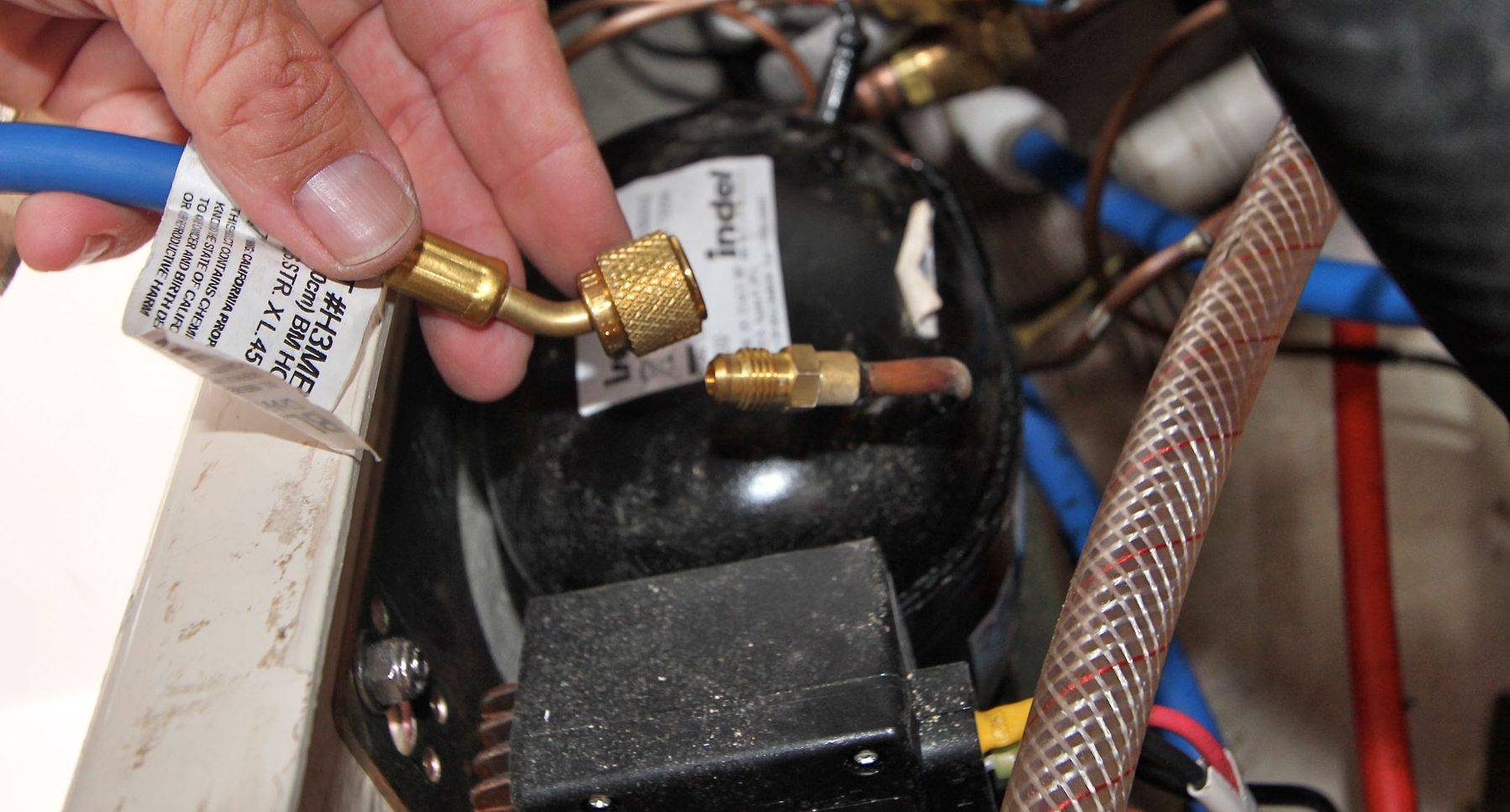 Чтобы определить, в каком месте из системы уходит хладагент, используют течеискатели. После этого устраняют причину течи и заполняют фреоном систему охлаждения. Если какие-то детали испортились из-за недостаточного количества хладагента в системе, их ремонтируют или заменяют.