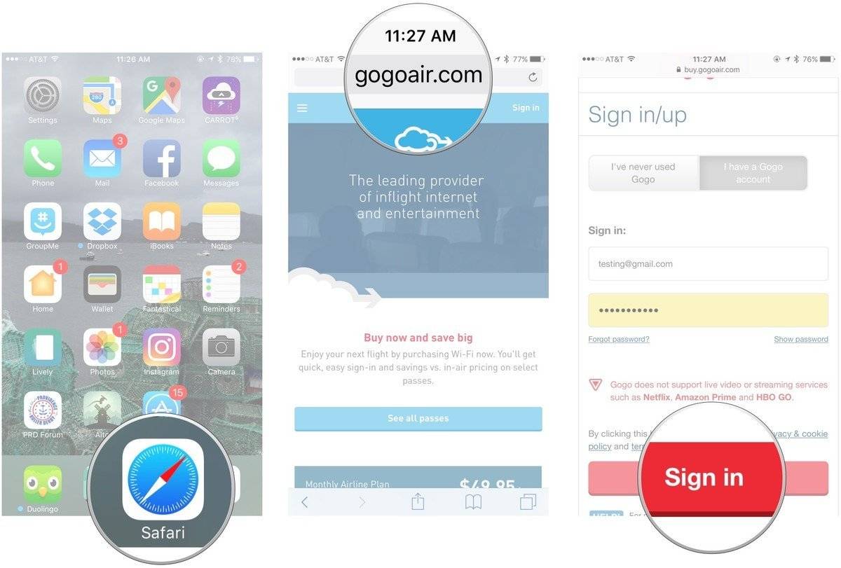 В любом случае вам нужно будет получить информацию о стартовой странице из информационных брошюр, у информационной стойки или консультантов в этой зоне действия сети, которые обычно владеют информацией о подобного рода вопросах. После того как вы будете знать страницу входа, ваши действия будут достаточно просты. Как пример можно показать этот процесс подключения на сервисе GoGoAir, но в целом они похожи и очень часто интуитивно понятны.