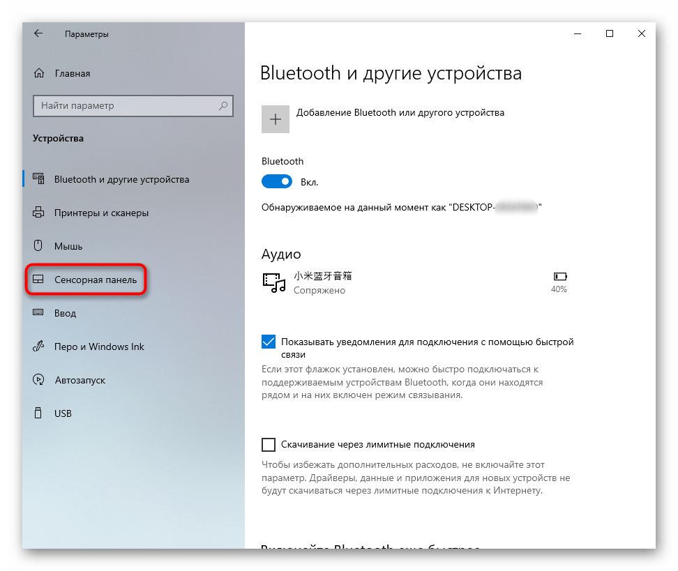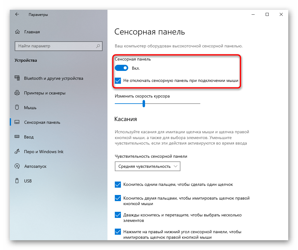В операционной системе присутствуют параметры, изменение которых позволяет включать/отключать сенсорную панель и настраивать ее.