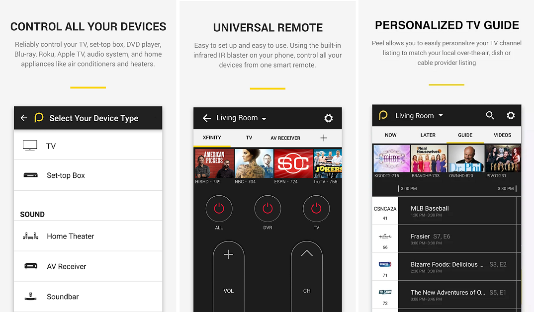 Peel, одно из самых популярных универсальных удаленных приложений, не только может подключаться к обычным телевизорам с телефонами, поддерживающими ИК-порт, но также поддерживает Smart TV через Wi-Fi. Автоматическая настройка приложения Peel позволяет без проблем работать с телевизорами любого бренда, но на этом поддержка не заканчивается.
