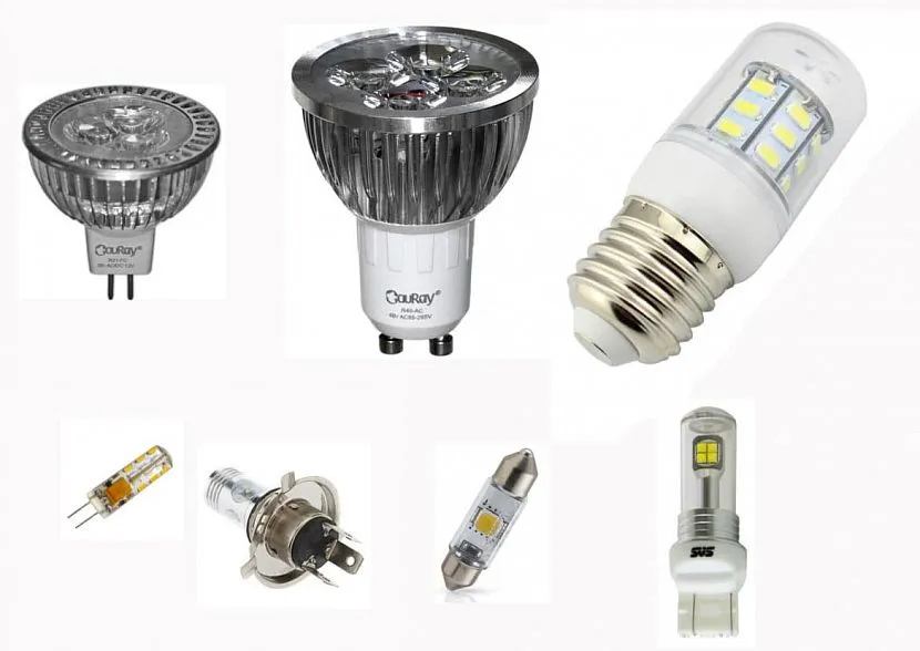 LED – светодиодные лампочки различных типов, тип цоколя может быть различным: E, GU или G.