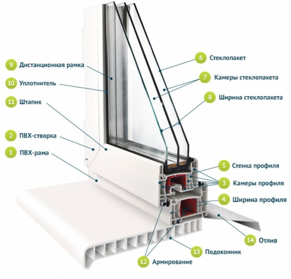 - Дополнительные детали, к которым относятся откосы, нащельники, подоконники. Для их изготовления также используется пластик. Характеристики и геометрические параметры напрямую зависят от места установки и размеров оконного проема.