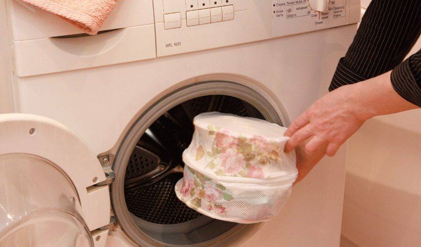 Совет! Если не получается вывернуть вещь, или вы сомневаетесь, что это обезопасит от повреждений соседние, тогда берите сетчатый мешочек. Прячьте в него «царапующую» одежду и кладите в машинку. Для крючковатого нижнего белья — бюстгальтеров и корсетов, используйте специальные контейнеры для стирки.
