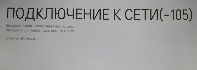 Как можно увидеть на фото выше, связь между телевизором и роутером есть (зеленная), а дальше нет подключения к DNS и интернету (серая). Получается, что наш LG Smart TV (система webOS) к Wi-Fi подключен, но интернет не работает. Отсюда разные ошибки: 105, 106 и другие. Сообщение «Не удается найти запрашиваемый адрес» в приложении YouTube.