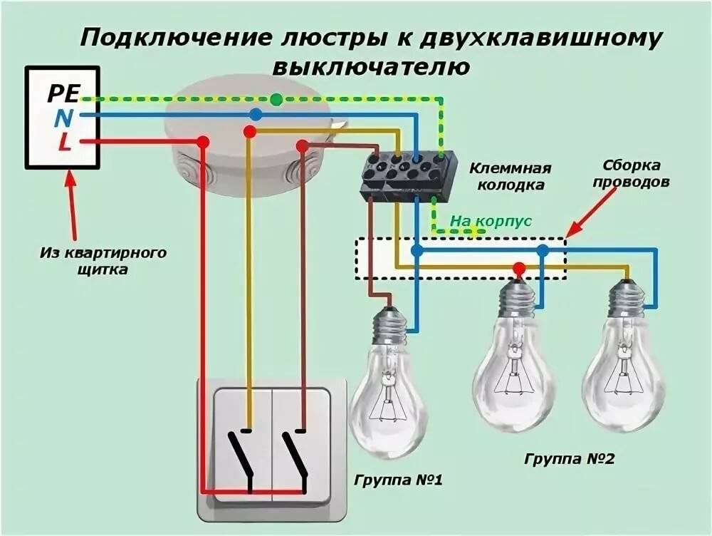 Подключается он к точно такому же проводнику на люстре. Лампы при работе на двухклавишном выключателе способствуют экономии электроэнергии, работая в подходяще режиме.