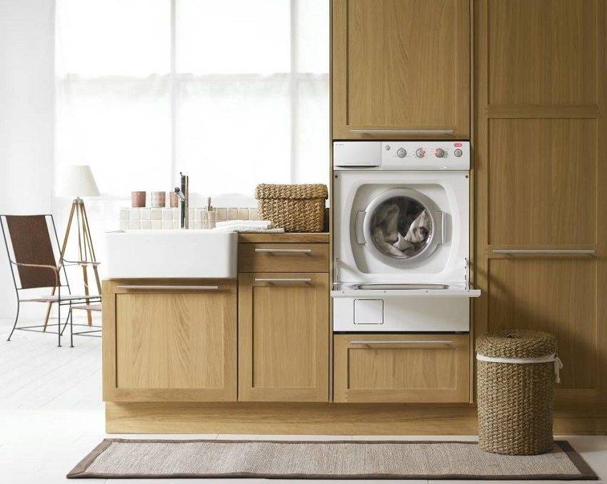 При некоторых вариантах планировки можно поставить стиральную машинку рядом с раковиной и накрыть влагостойкой столешницей, которую можно использовать в бытовых целях.