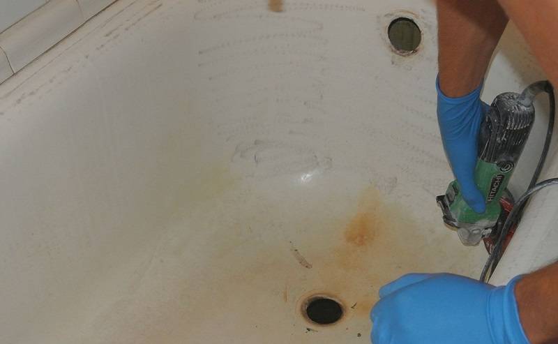 При работе с машиной для шлифования образуется много мельчайшей пыли, снять старый слой краски легче электродрелью. Возле сливного отверстия и во внутренних углах удобнее работать щеткой или наждачной бумагой. После обработки поверхность изделия будет матовой и шероховатой. С нее исчезнет ржавчина и застарелые загрязнения.
