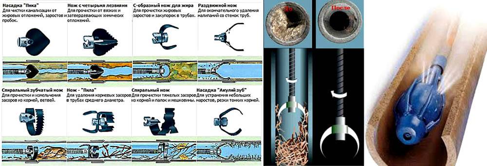 Вид насадки выбирается в зависимости от типа засора и способа его устранения: