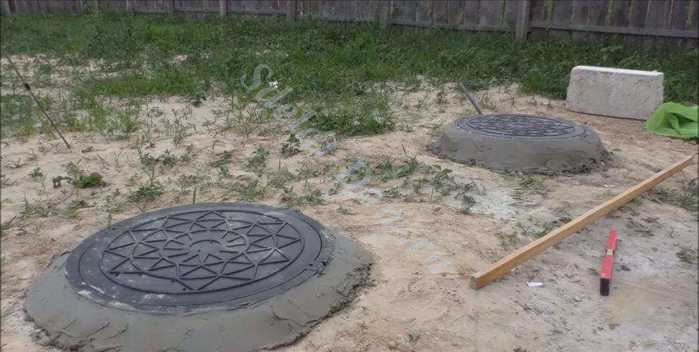 Завершающий фактор основных работ – установка перекрытий на кольцах. Накрываются емкости бетонной плитой с отверстием под люк. Засыпают колодец ранее вынутой землей, смешанной с песком. Равномерно распределяют по всей поверхности и тщательно уплотняют.