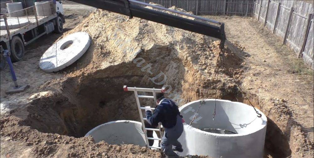 Катить кольца по поверхности запрещено, от такой транспортировки появляются трещины. К монтажу стоит привлечь специализированную технику, которая обеспечит кольцам подачу в вертикальном положении. Перед установкой стоит подготовить основание: песчаная подушка высотой в 30 см и бетонированная стяжка высотой в 20 см. Основание предотвращает попадание стоков в почву. Стяжку можно заменить цельной бетонной плитой или кольцами с бетонным дном. Однокамерные септики не бетонируются, достаточно дренажной подушки.