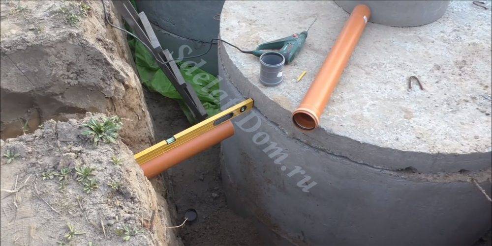 Монтируем трубу перелива между кольцами уровнем ниже, чем трубу из дома