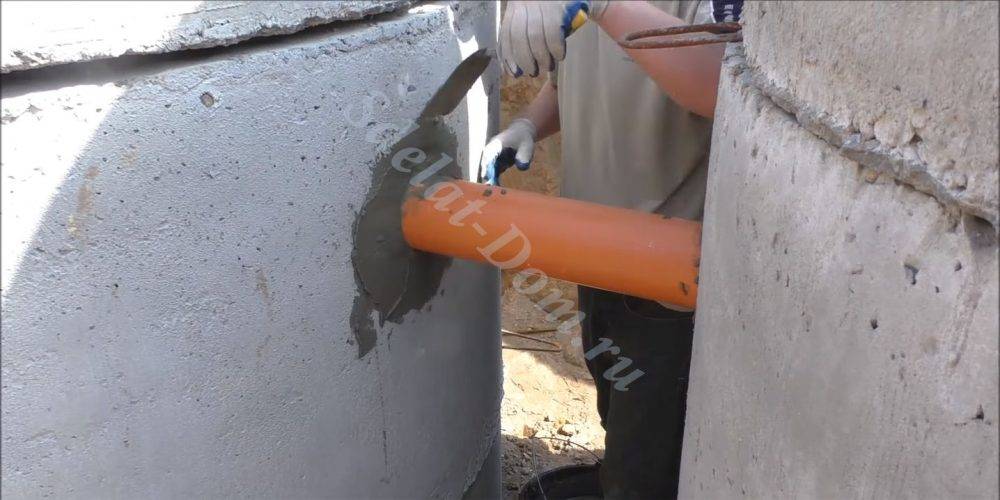Для вставки ввода от канализации в доме и переливных труб между камерами в бетоне придется пробить отверстие соответствующего размера. В идеале его следует просверливать алмазной коронкой, чтобы края у дырки получились ровными. Так вставляемые в септик переливы из металла или пластика будет проще герметизировать. При этом вводы в камеру всегда располагают выше выводов.