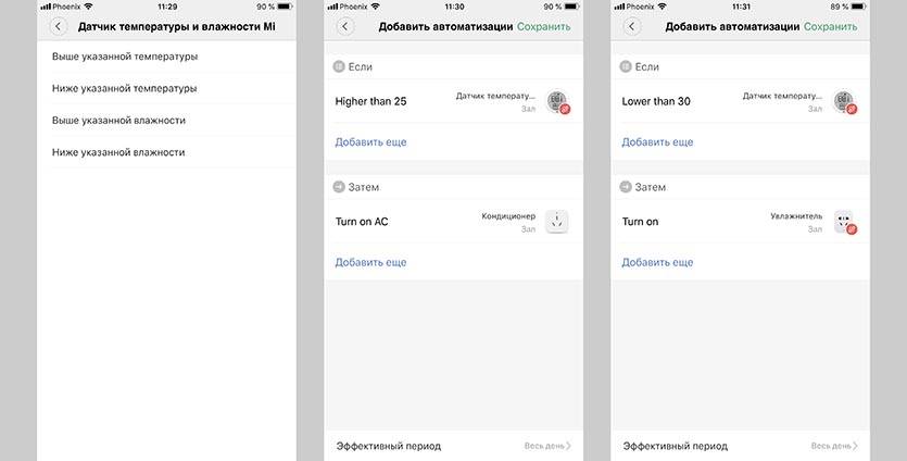 Теперь пара простых сценариев будет включать кондиционер или увлажнитель в зависимости от показаний с датчика температуры и влажности.