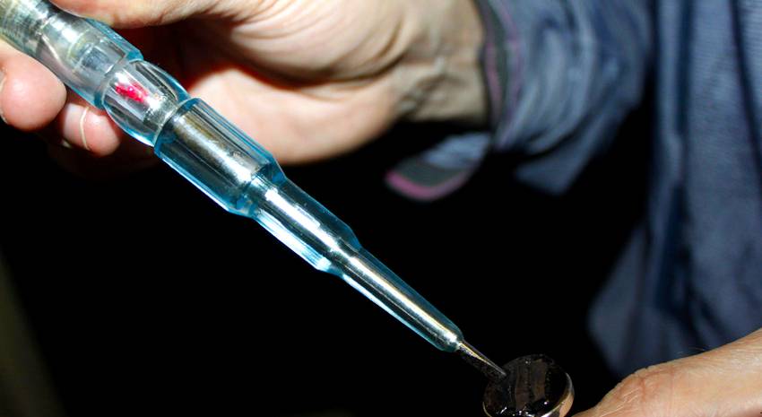 Важным условием работы тестера является замыкание второго контакта, находящегося на рукоятке. Для этого необходимо коснуться торцевой части прибора (пятачка) пальцем (тело мастера служит элементом цепи). Благодаря встроенному резистору, сила тока, проходящая через инструмент, безопасна для пользователя.