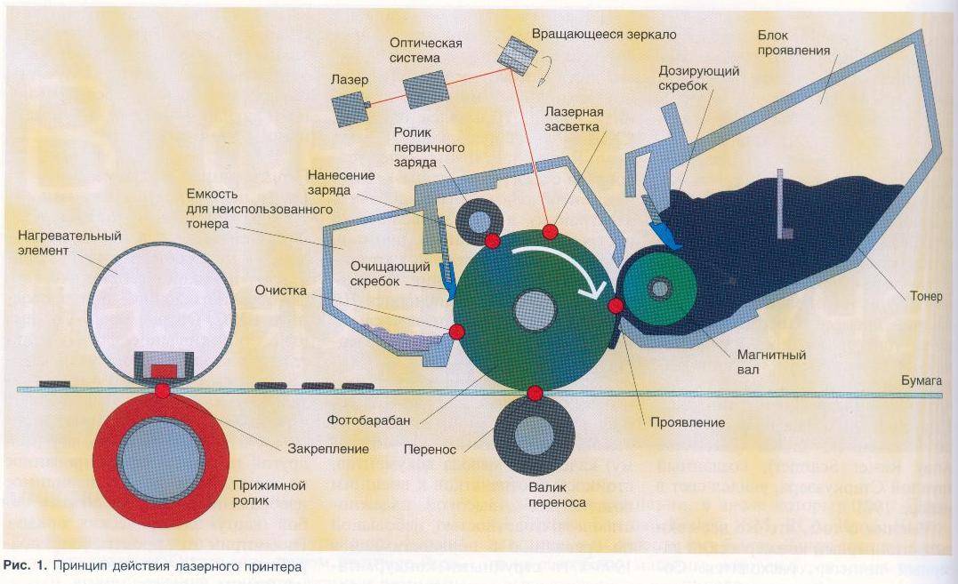 В отличие от матричных и струйных моделей принтеров, у которых символы, передаваемые процессором на печатную головку, воспроизводятся на бумаге посредством красящей ленты или капель краски, процесс печати в лазерном аппарате многошаговый. Так, сначала происходит предварительный заряд фотобарабана, затем зкспонирование скрытого изображения лазером, далее перенос оттиска на бумагу с последующей его тепловой обработкой.