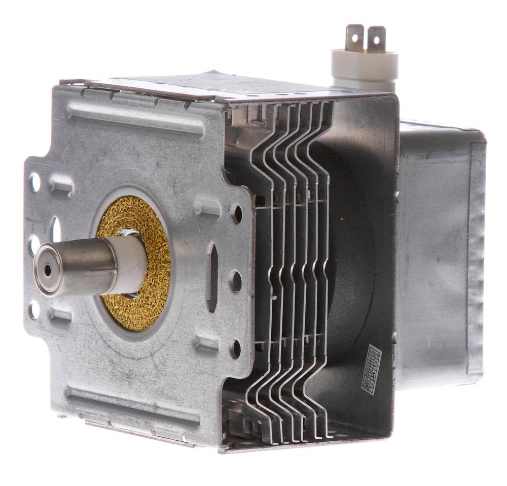 Магнетрон — это сердце микроволновки. По сути, это обычная вакуумная лампа, похожая на те, которые использовались в кинескопах старых телевизоров. Только магнетрон генерирует интенсивную электромагнитную волну высокой частоты, образуемой при прохождении электронов через магнитное поле.