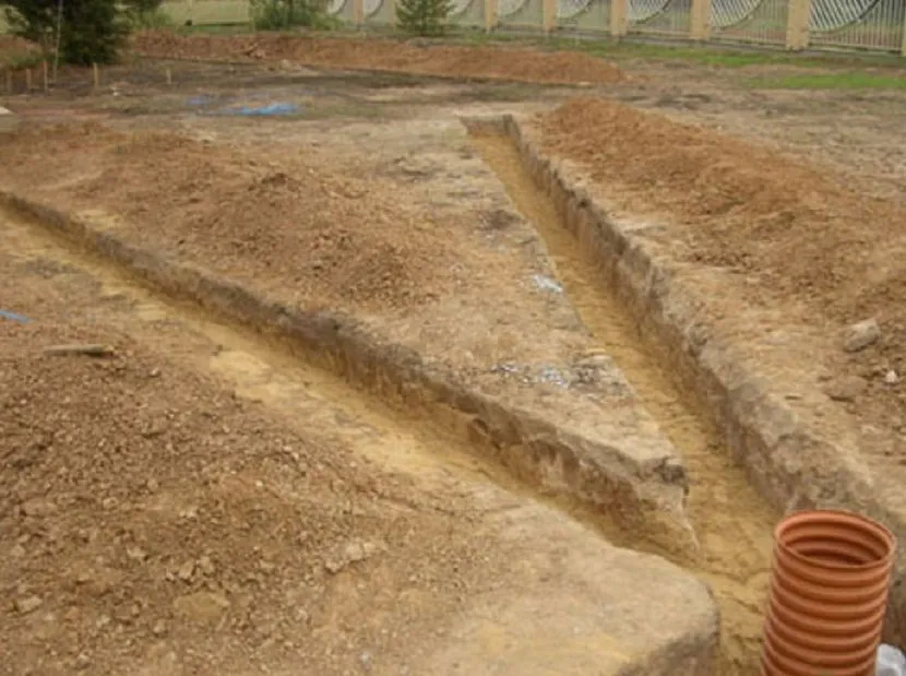 Выполняя раскопку траншей, учитывают уклон будущих трубопроводов (или лотков) в сторону центрального водосборника-накопителя. Днище готовых траншей уплотняют путём трамбовки и засыпают слоем речного песка (высотой не менее 200 мм)