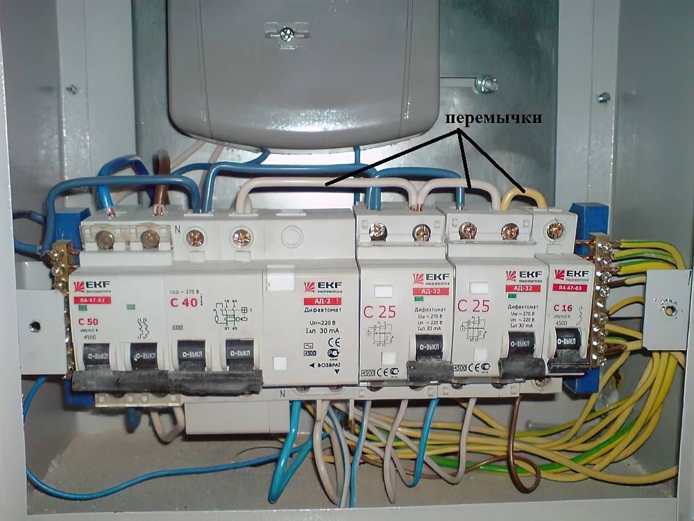 Автоматы в одной группе соединяют перемычками: фаза приходит общая