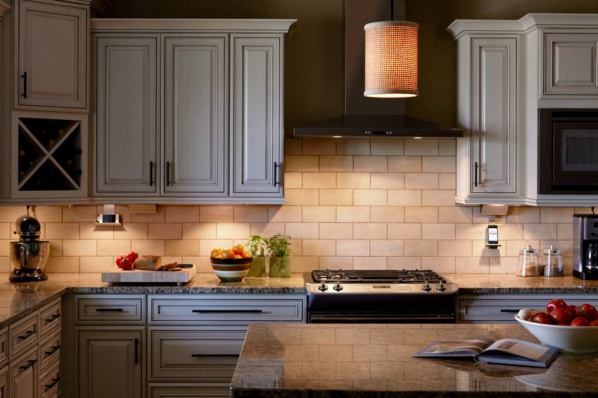 Однако организация освещения рабочей зоны на кухне внизу навесных шкафов создает две проблемы: неприглядный внешний вид и дискомфорт от яркого света для сидящих за столом. Решить оба вопроса можно с помощью декоративной планки, которая будет закрывать светильник и ограничивать свет, делая освещение более мягким.
