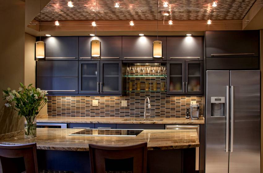 Если подвесные шкафчики оснащены карнизом, то это наиболее удачное место для расположения точечных светильников. Мебельные светильники для кухни в виде светодиодной подсветки можно установить внутри шкафчиков с прозрачными дверями. Она будет срабатывать при открывании дверок.