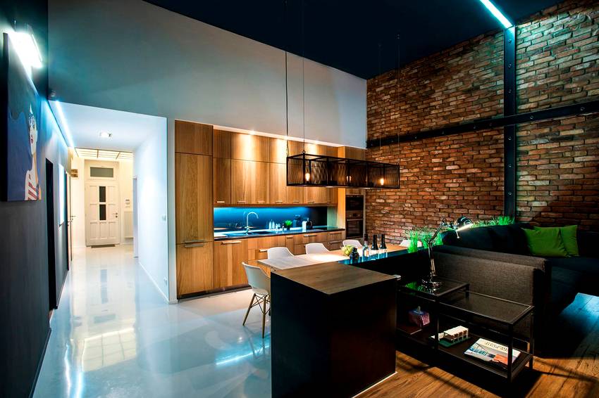 Если нужно обеспечить освещение в однокомнатной квартире, то тут необходимо выделить сразу несколько зон в одном помещении. Подойдет комбинированный тип источников света. Рекомендуется установить люстру для общего освещения комнаты, а по бокам монтировать точечные светильники, для подсвечивания нужных зон.