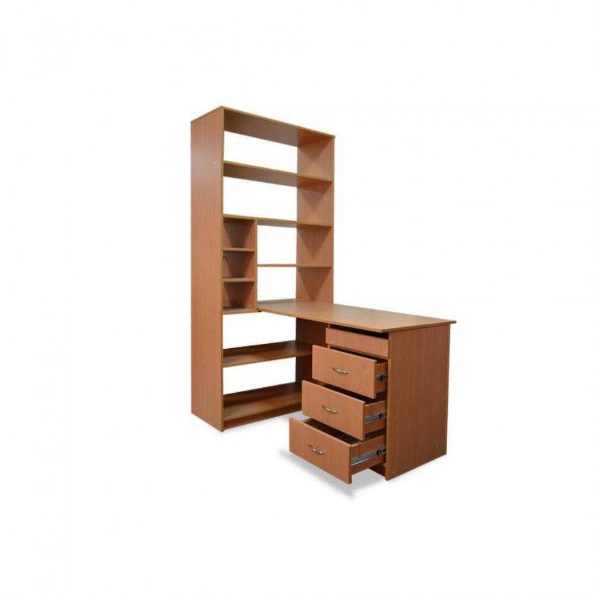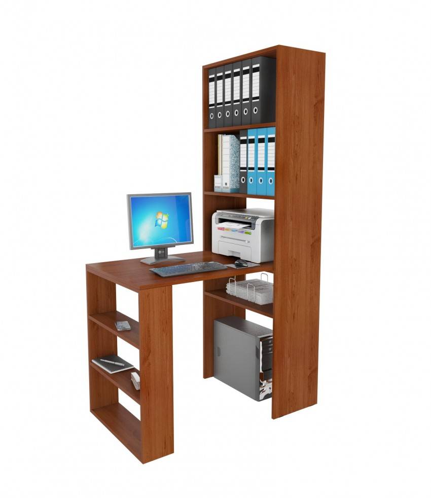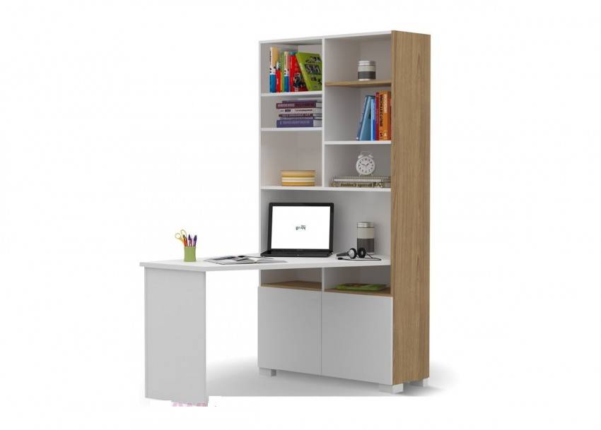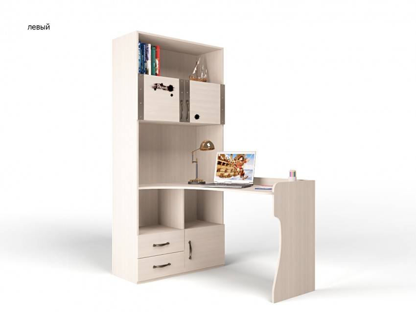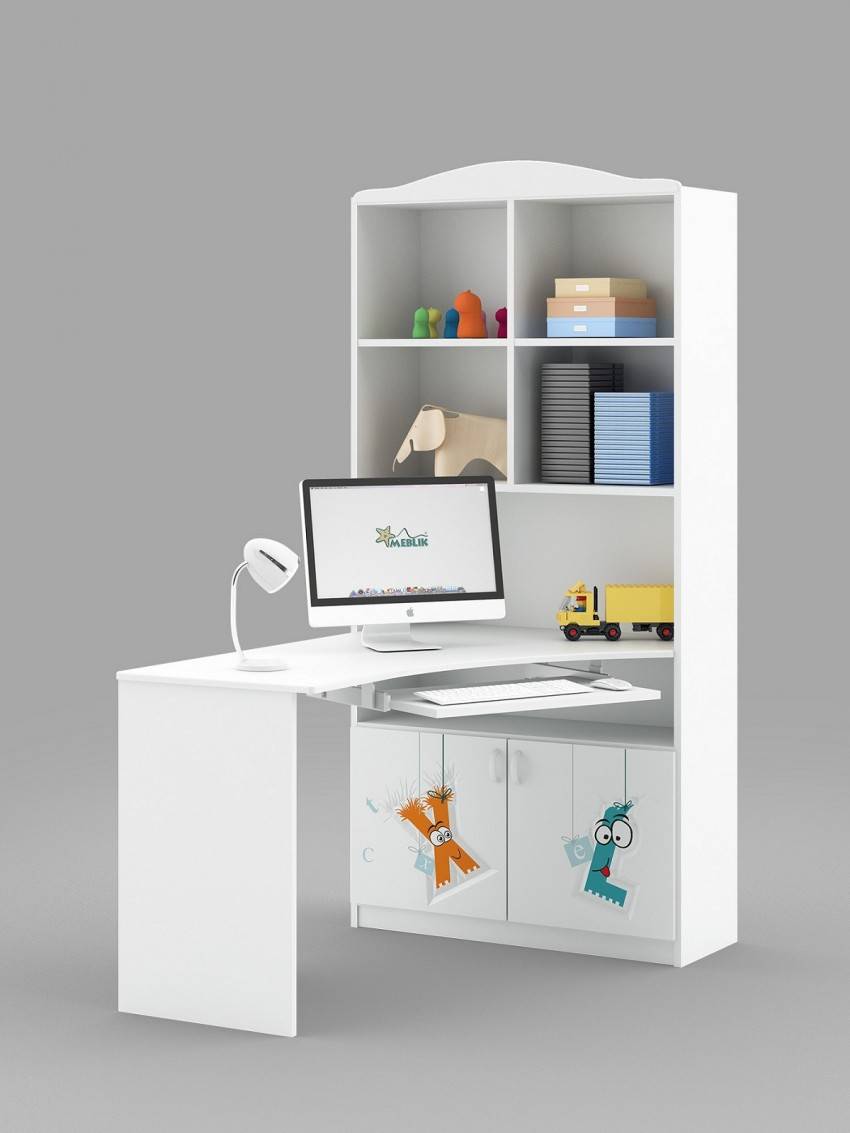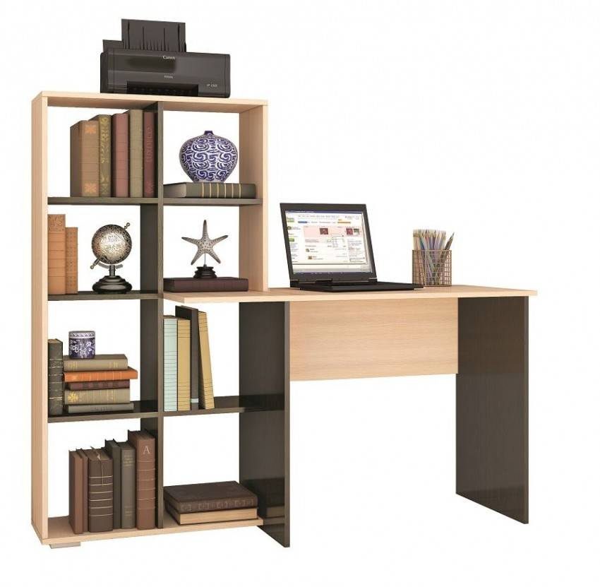 - СП-55 – угловой вариант, совмещенный со стеллажом, может похвастаться удачной компоновкой. Системник здесь размещается в открытой нише над тумбой, для принтера есть своя полочка в шкафу, над нишей для монитора можно разместить колонки. Стол диагонально-перпендикулярный, так что на столешнице вполне достаточно места и для сканера. Стоимость модели – 10700 р.