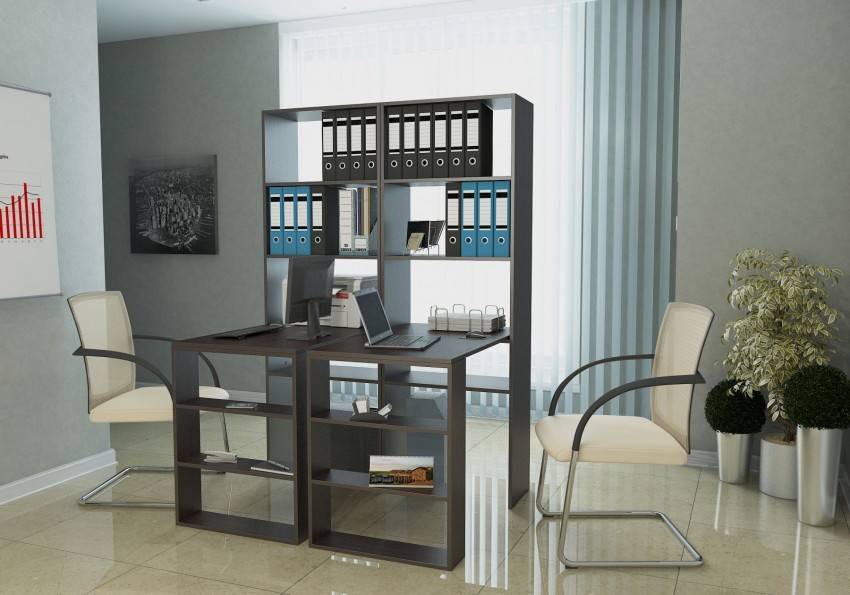- Траст-2 – вариант для работы с документами. Общая длина модели – 140 см, из них столешница занимает 100 см. а стеллаж, устроенный над отсеком для системника – 40 см. Есть вместительная выдвижная полка и тумба с открытой верхней нишей для модема. Надстройка включает также глухой отсек и верхнюю полку. Высота полок рассчитана на вертикальную установку папок. Цена модели – 7570 р.
