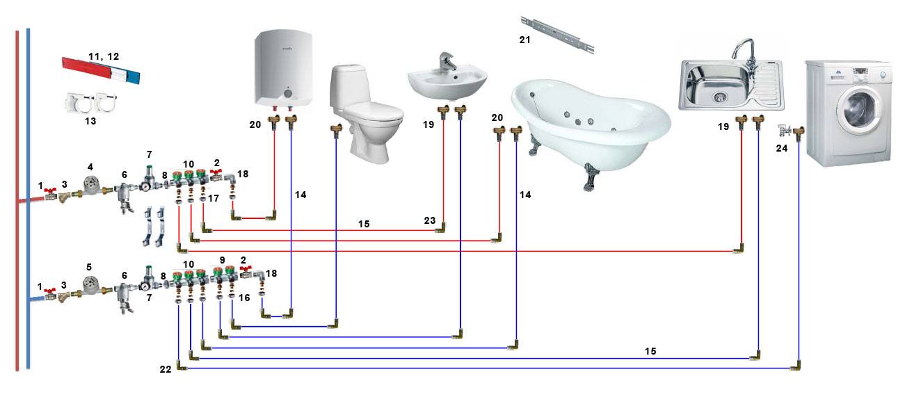 Данный тип водопровода отличается подведением каждой трубы к основному коллекторному устройству от любой точки водозабора. Под системы с горячей и холодной водой организуются отдельные коллекторы.