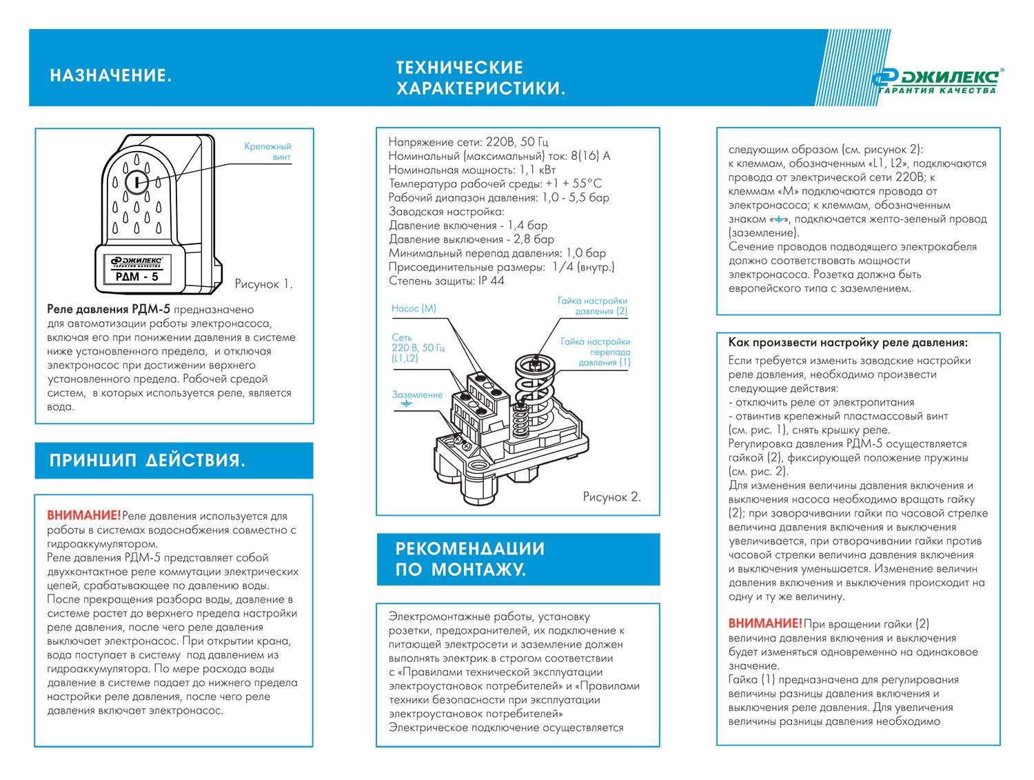 - Электронное реле РДЭ-10 Универсал-1,5 G1/2″, изготовитель Акваконтроль, Россия. Защищает от сухого хода. Автоматически включает насос после остановки. Присоединительный размер —1/2″. Максимальное давление — до 6 бар. Номинальный коммутируемый ток — 6.9 A.