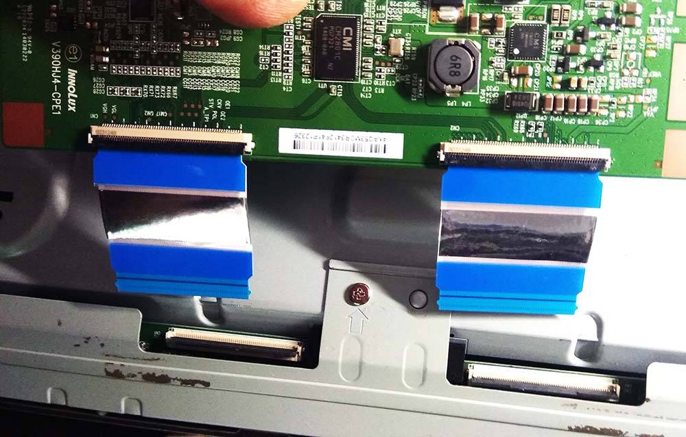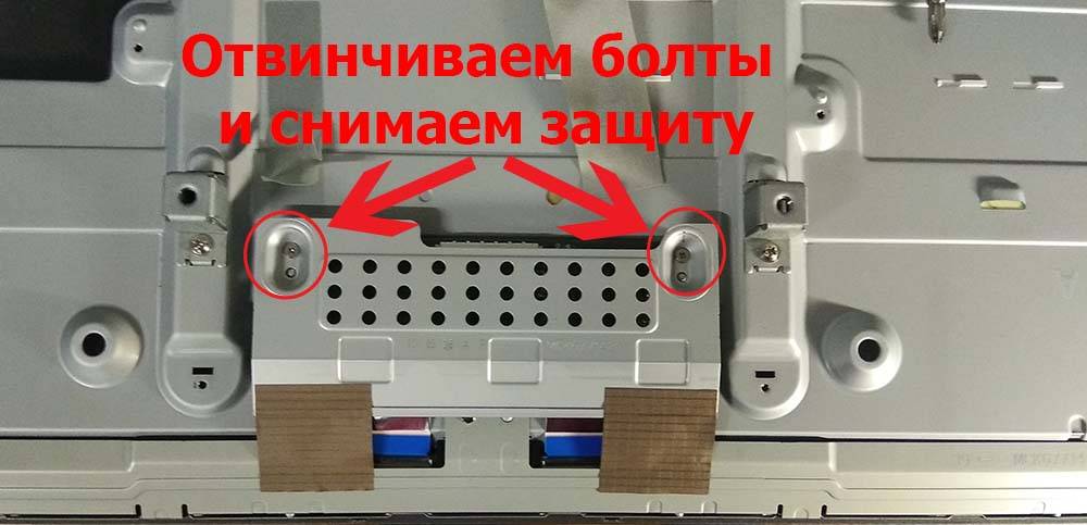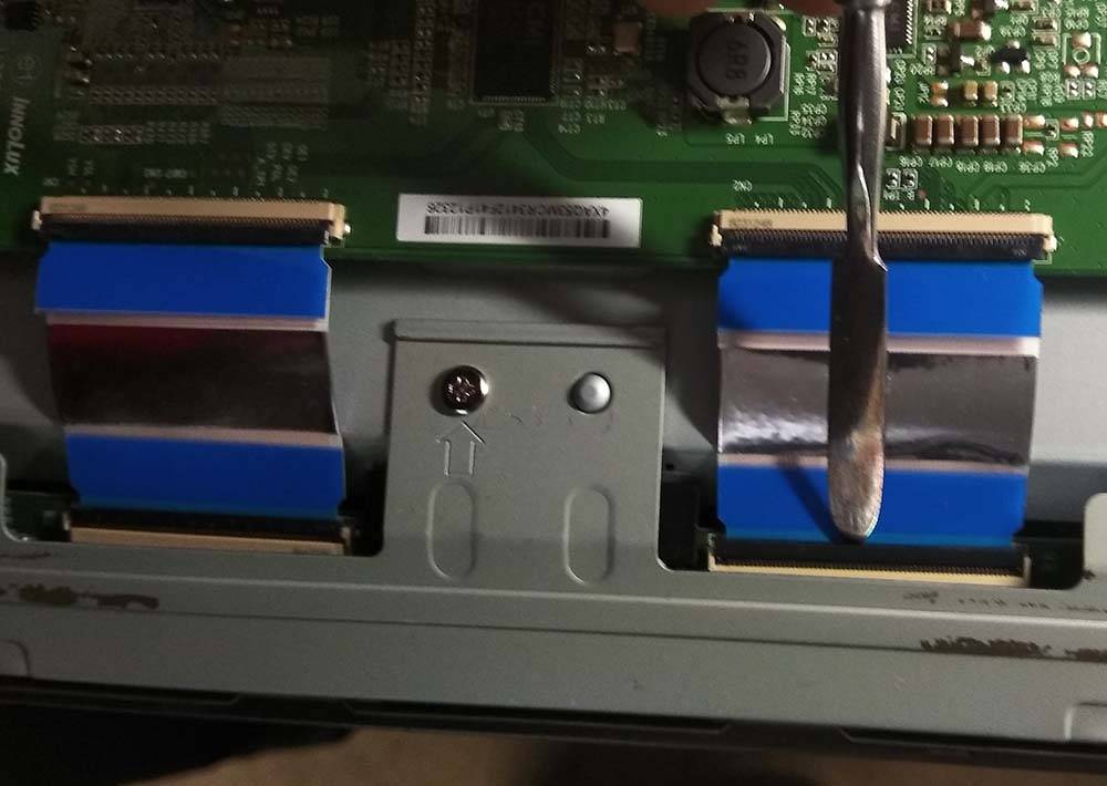 Вначале надо отключить шлейфа, которые идут от ЖК панели к плате T-con и выкрутить болт между ними