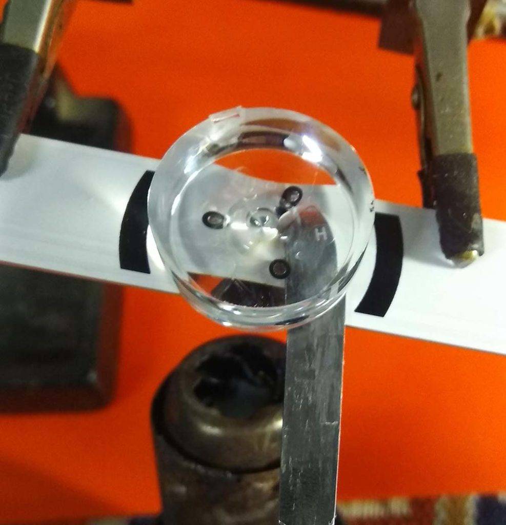 Очень важно, чтобы клей не попал на светодиод, тем самым не испачкал внутреннюю часть линзы