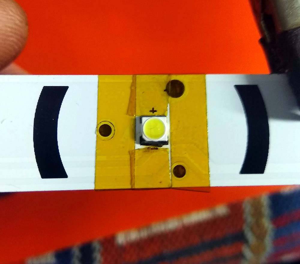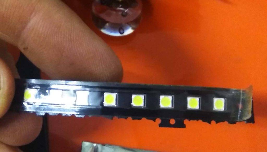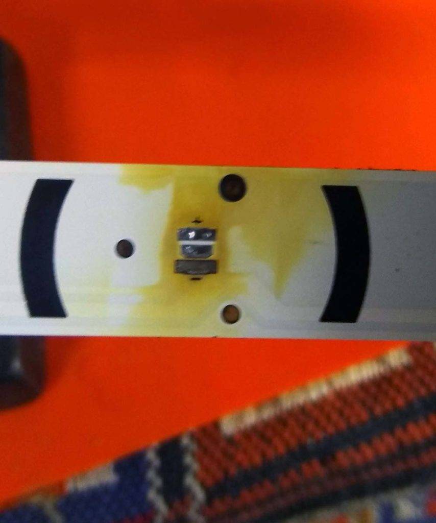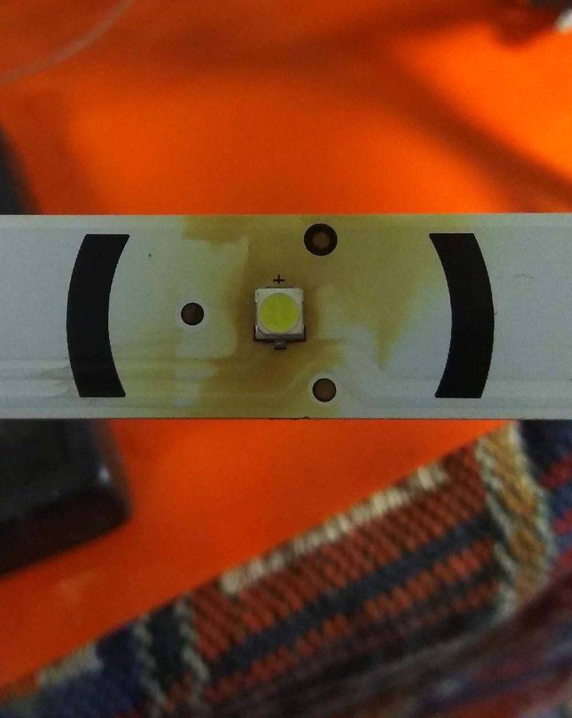 Если посчастливилось купить готовые линейки от производителя — задача решается просто: они устанавливаются на место старых целиком. Даже без проверки отдельных диодов. Есть и более сложный путь. Найдя сгоревшие диоды, их вырезают вместе с участком подложки с проводниками. На это место помещают такую же деталь, получаемую из новой линейки. Все, что останется — восстановить дорожки, то есть подпаять в разрыв пару коротких проводников.