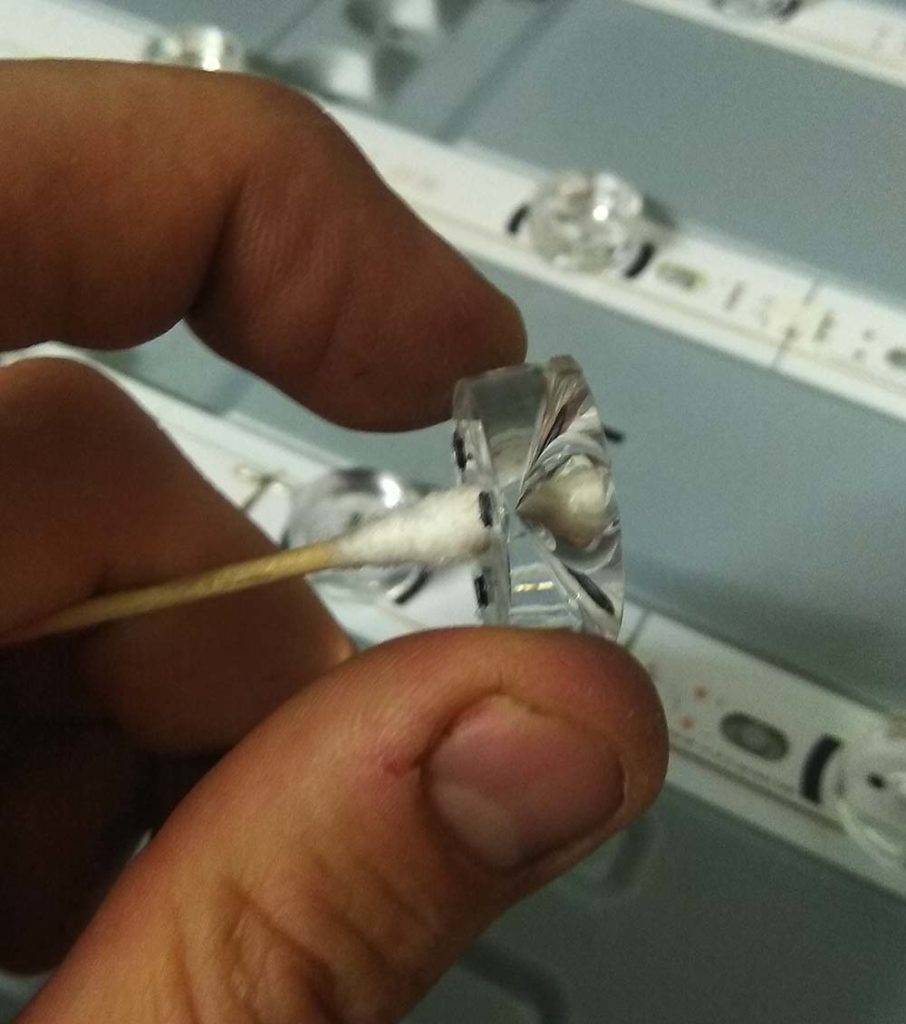 Перед установкой линзы, хорошо протираем внутреннюю часть линзы ватной палочкой.