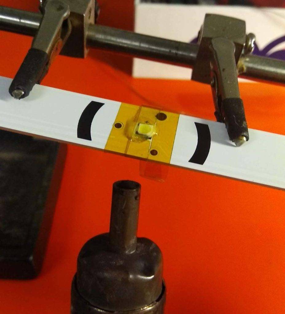 Первым делом при замене отсоединяют пластины старых диодов. Поскольку крепят их с помощью специального двустороннего скотча, то для отсоединения тот прогревают или мощным бытовым, или паяльным феном. Планку фиксируют в держателе, после чего направляют включённый на нужную мощность прибор и ждут пока расплавится олово на скотче. Впаивание происходит точно так же, что избавляет от опасности повреждения заменой детали.