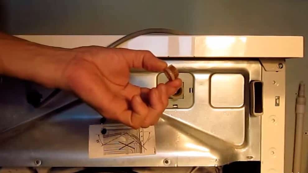 Промывают фильтр машины под краном, для чистки можно использовать хозяйственное мыло, гель для мытья посуды, уксус или соду. Затем элемент собирают и устанавливают обратно в гнездо.