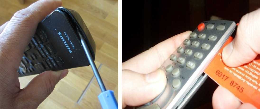 Вводят осторожно между половинками корпуса ДУ ножик, отвертку или старую карту (пластиковую).