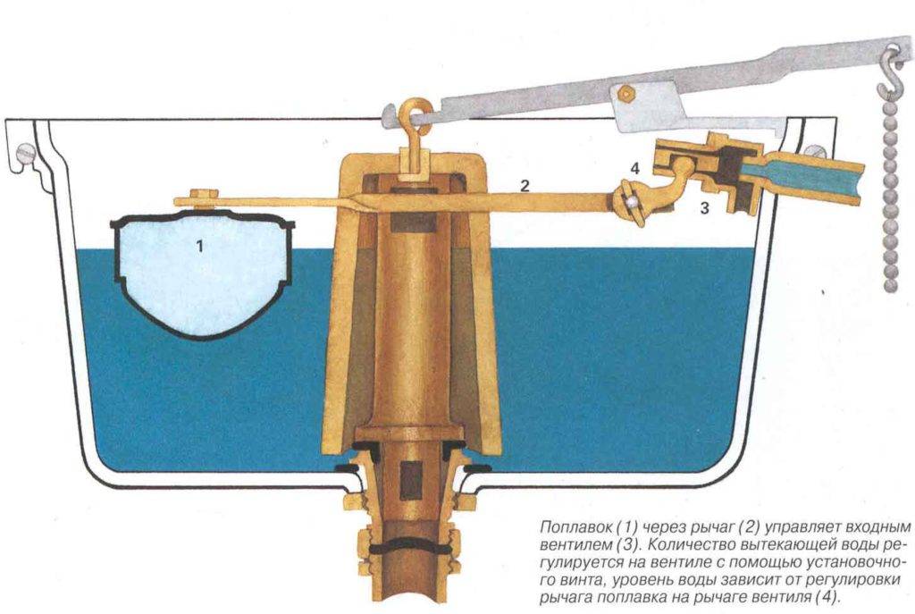 В этом случае вода будет постоянно утекать. Достаточно поправить «грушу», проверить её плотное прилегание к седлу, чтобы устранить проблему протечки воды. Перекошенный поплавок не даёт закрыться подающему клапану. Бачок беспрерывно заполняется водой, которая стекает в чашу унитаза через переливную трубку.