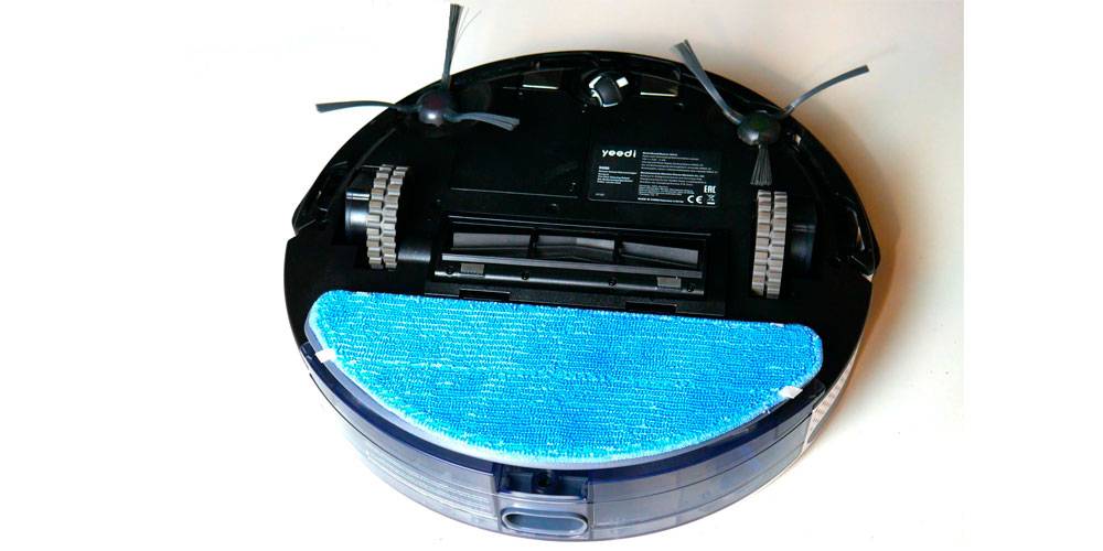 Yeedi K650 – редкий представитель доступных моделей, который умеет одновременно собирать мусор и протирать пол. В комплекте есть одноразовые салфетки и многоразовая микрофибра. Во время мойки она прижимается к полу за счет специальных пружин, что позволяет устройству не просто проводить по полу влажной тканью, а действительно его мыть. Увлажнение происходит в автоматическом режиме через специальные сопла. Благодаря большой емкости контейнера воды хватает на весь процесс.