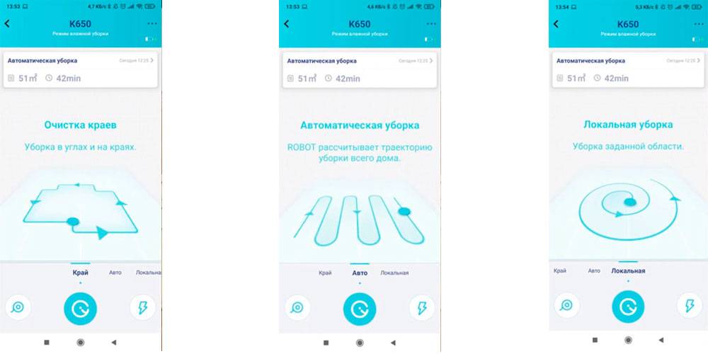 На главном экране утилиты можно выбрать один из трех режимов работы, так как девайс не рисует карту, то во время уборки здесь же просто выводится анимация его работы.