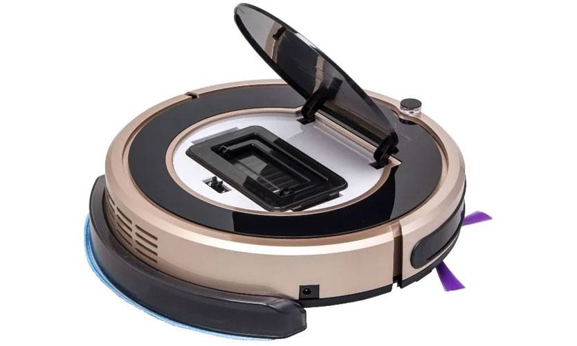 Корпус производится из специального усиленного пластика, имеющего матовое покрытие с торцевых частей, верхняя часть глянцевая. Конструкция обладает золотистой окраской, что делает ее еще красивее. Форма устройства классическая для роботов-пылесосов – круг. На корпусе с фронтальной стороны располагается сенсорная панель, на которой можно обнаружить несколько кнопок. Она может использоваться в том числе и для активации гаджета. Примерно здесь же находится крышка, закрывающая отсек пылесборника, который в случае необходимости можно с легкостью извлечь.