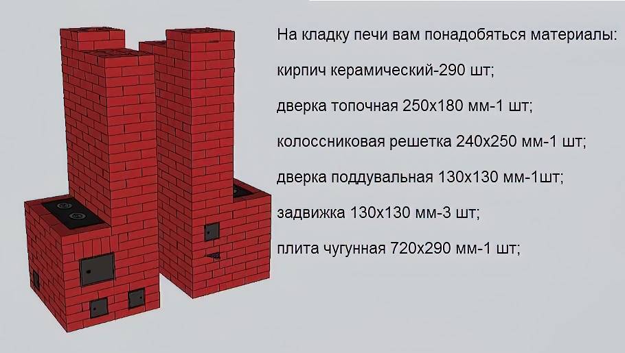 Печь из полнотелого керамического кирпича (не пережженного). Без учета боя требуется 290 штук. Кладку вести на глиняный раствор, толщина швов — порядка 0,5-1,8 см.