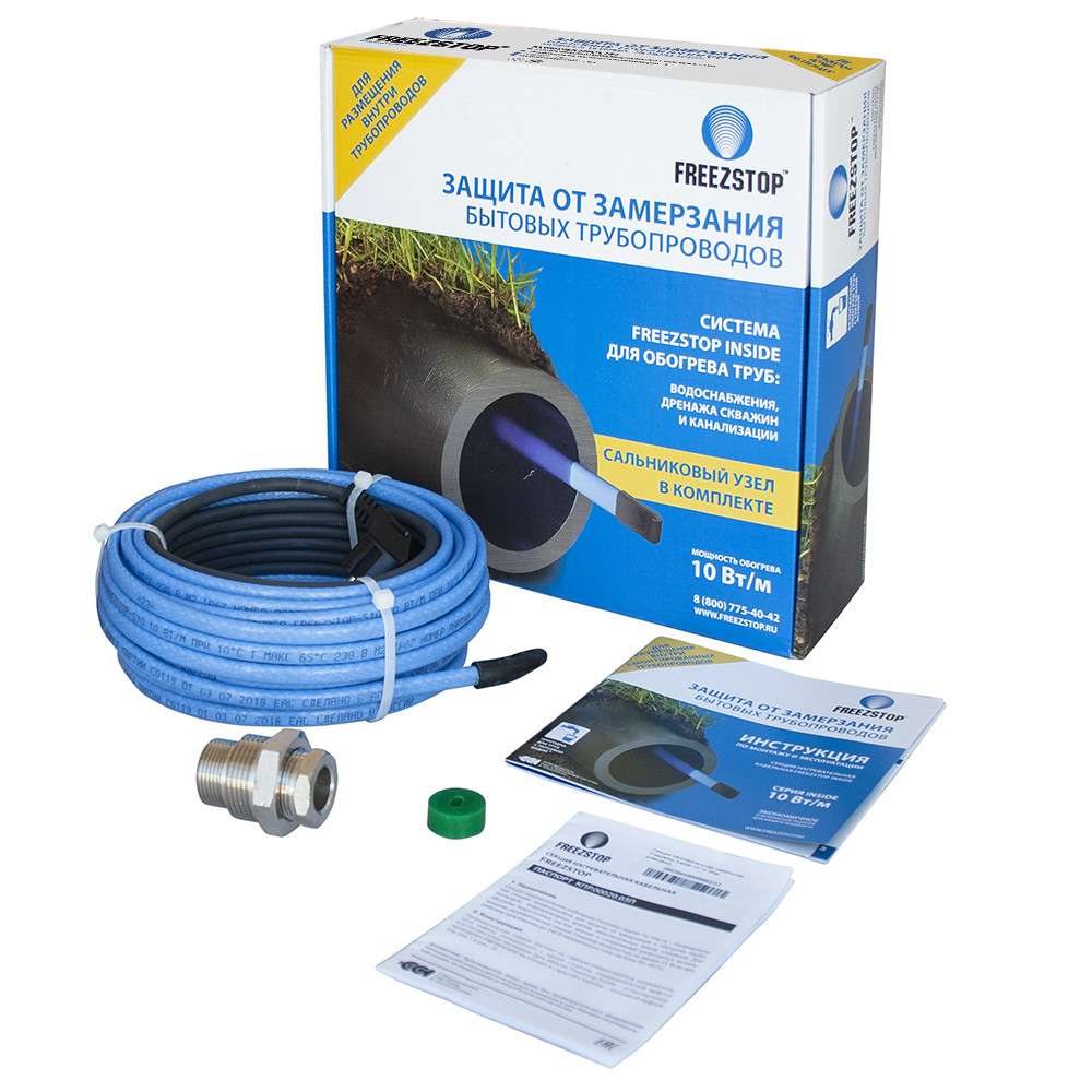 Греющийся кабель можно прокладывать не только снаружи, но и внутри трубопровода. Соединительная и концевая муфты не боятся механических повреждений и полностью герметичны. Для удобства ввода кабеля в трубу используется специальный сальниковый узел из резинового уплотнителя, шайб и втулок. Мощность устройства — 40 Вт, минимальный радиус изгиба составляет 35 мм. Одной из особенностей комплекта является устойчивость к экстремальной температуре. Он стабильно функционирует в диапазоне от -50 до +50 °C. Экранирование обеспечивает защиту от внешних помех.