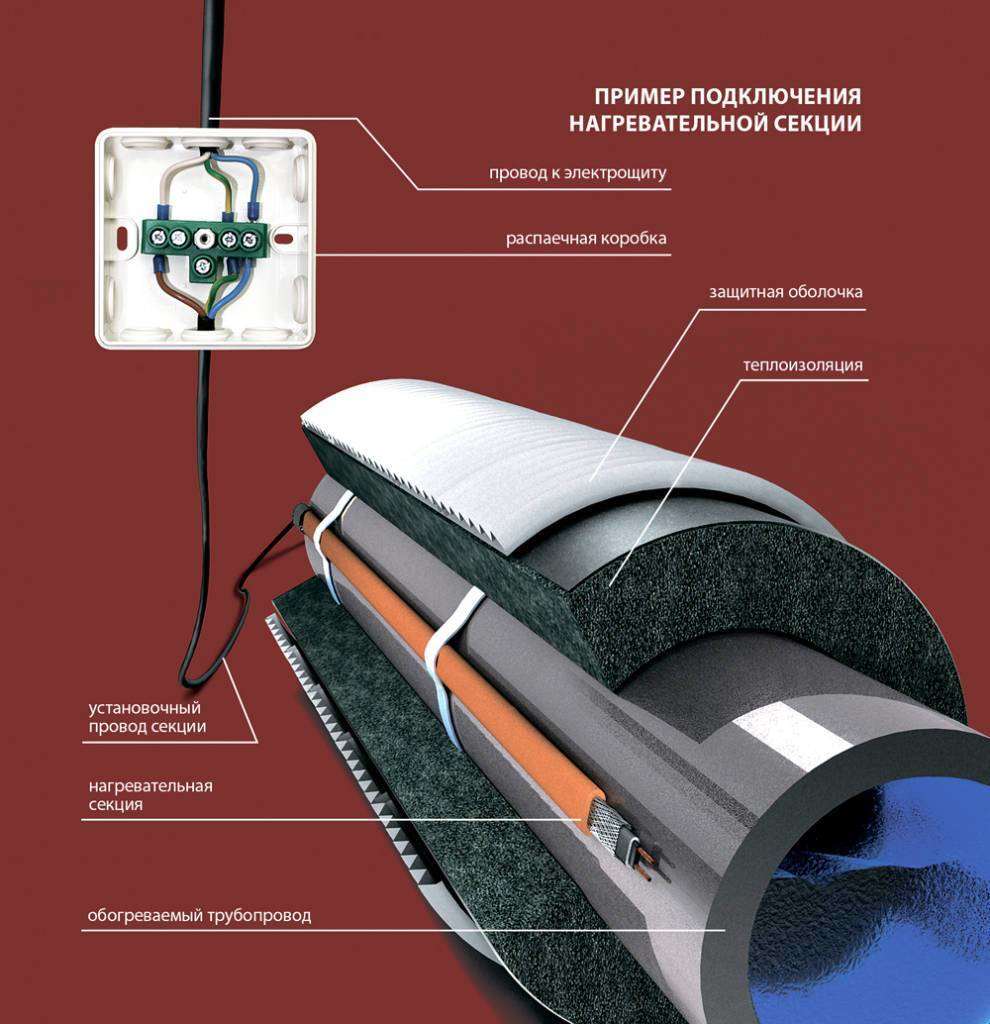 Сначала монтируется греющий кабель, схема подключения часто указывается производителем в документации, прилагающейся к обогревательному элементу. Следующим этапом монтажа такой системы является установка кожуха для защиты. В последнюю очередь проводится подключение кабеля к сети и проверка его работы. Кроме того, можно произвести монтаж греющего кабеля внутри трубы. Это повысит его эффективность.