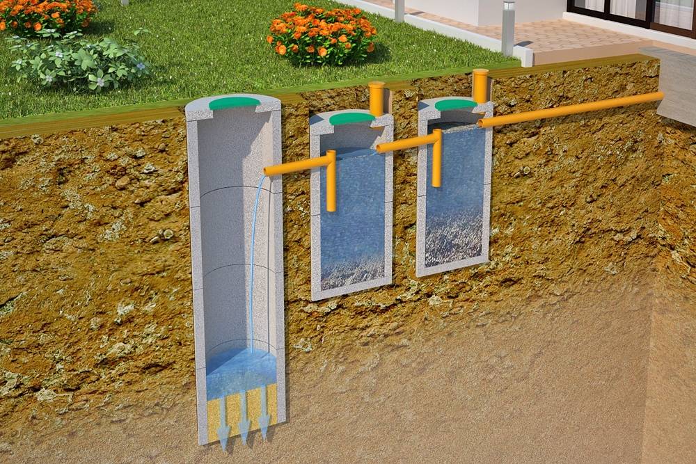 Когда стоки попадают в первую камеру они очищаются, потому что тяжелые фракции оседают, а те, которые легче перетекают в следующую камеру. Перелив осуществляется по мере заполнения первой, и уже в последней камере осуществляется полная очистка жидкости, которую можно использовать для полива или направить в дренажный колодец.