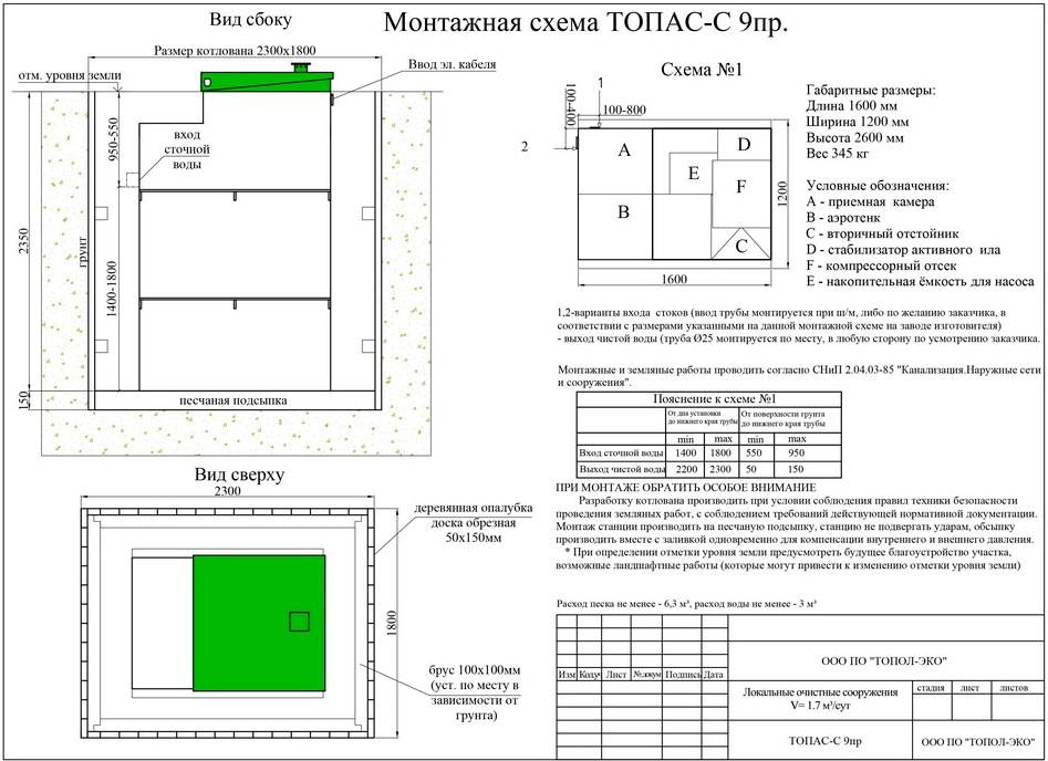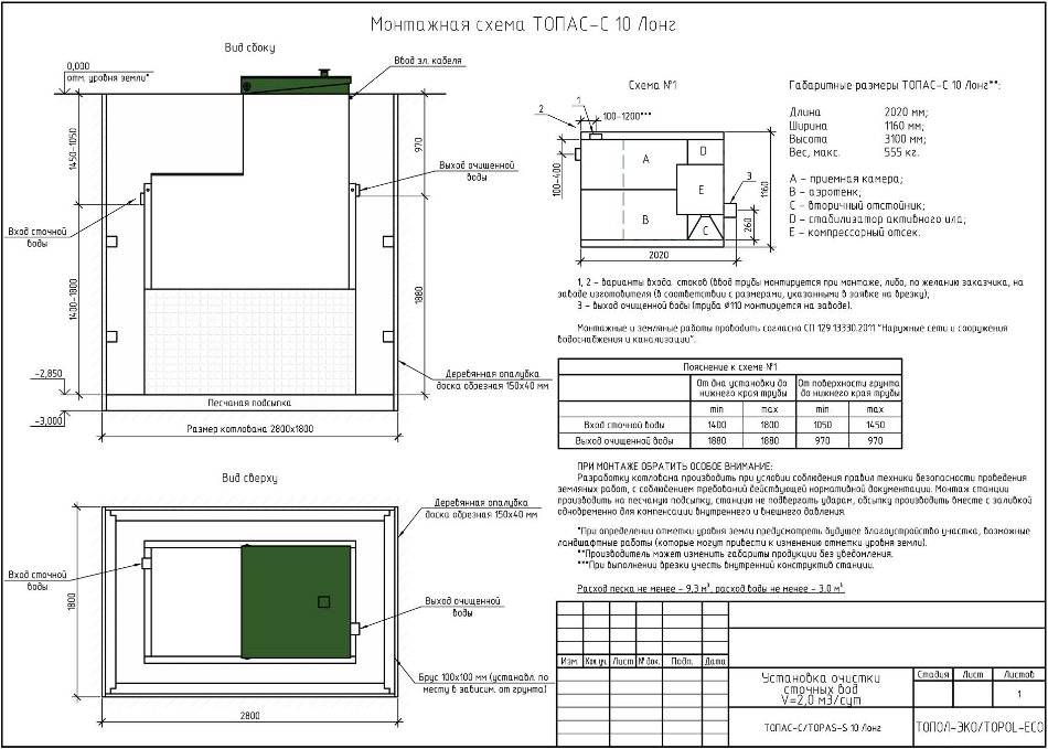 «Топас 9» перерабатывает стоки 9 человек. Суточная норма — 1.7 м3, залповый сброс — максимум 510 л. Базовые размеры (ДхШхВ): 163х117х255 см. Разброс цен: 132-187 тыс. рублей.