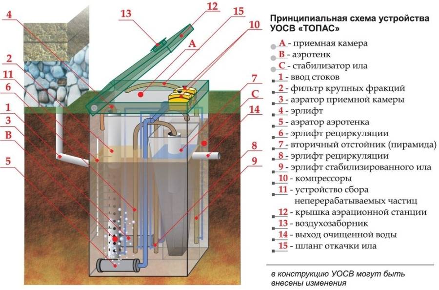 Процесс очистки в септиках Топас можно разделить на несколько основных этапов. Основную работу выполняет активный ил, за счёт биологического окисления поступивших в камеру стоков. Обслуживание канализаций Топас обходится достаточно дёшево за счёт экономичных технологических решений (энергоэффективные насосы, современная система управления и пр.).