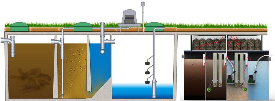 Отдельный отдел септика оснащен лучшими компрессорами, распределительной коробкой, блоком управления, электроникой.